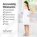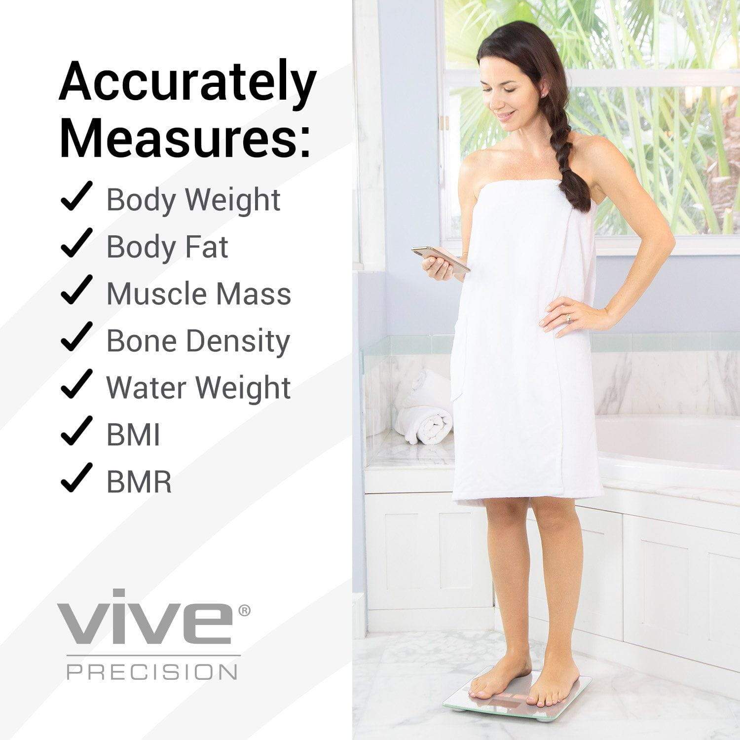 The Vive Precision smart body fat scale, meticulously tested for accuracy, simplifies health tracking by offering eight essential measurements. Utilizing precision sensors and bioelectrical impedance analysis, this scale provides a thorough body composition analysis, covering body weight, body fat, muscle mass, bone density, water weight, BMI, and BMR. -