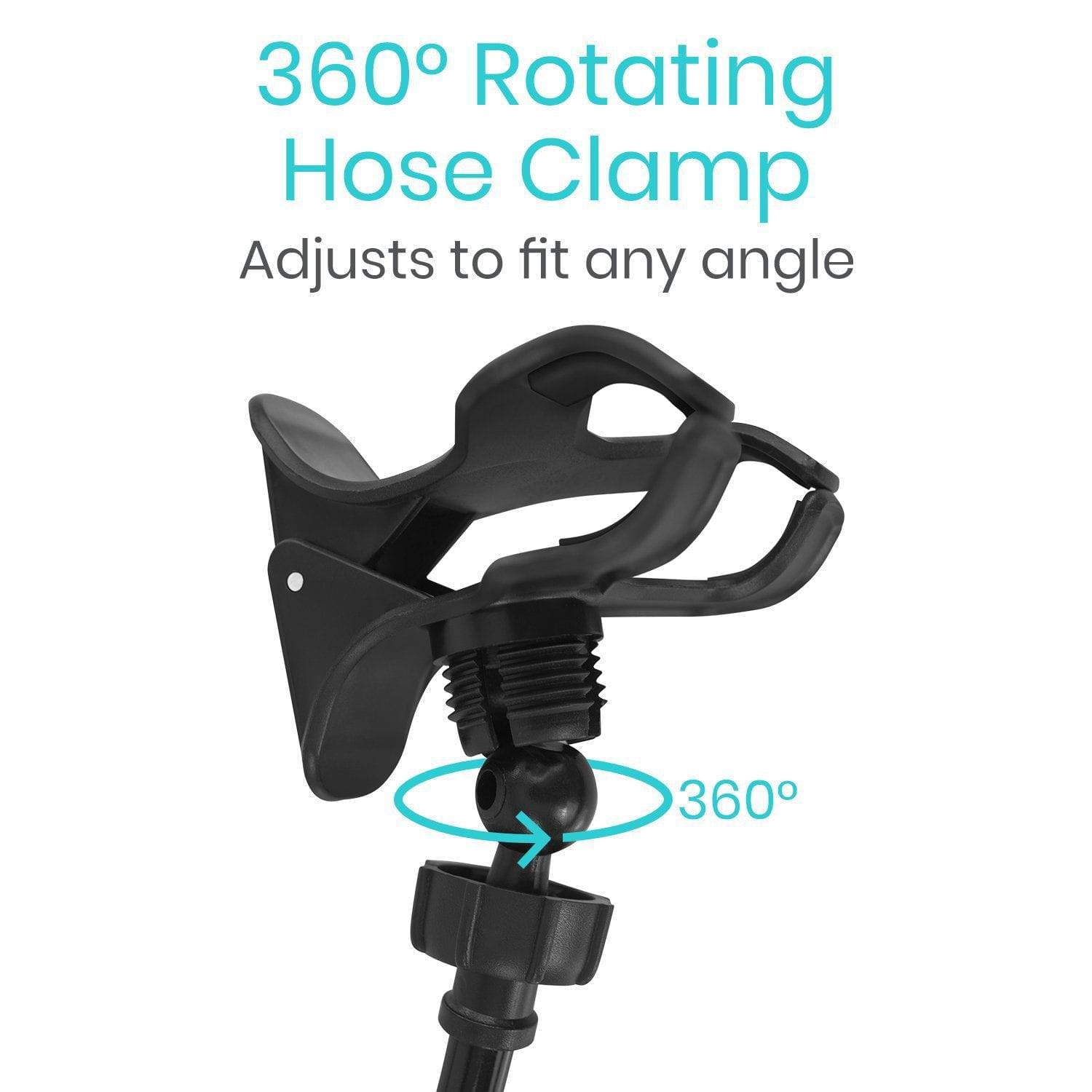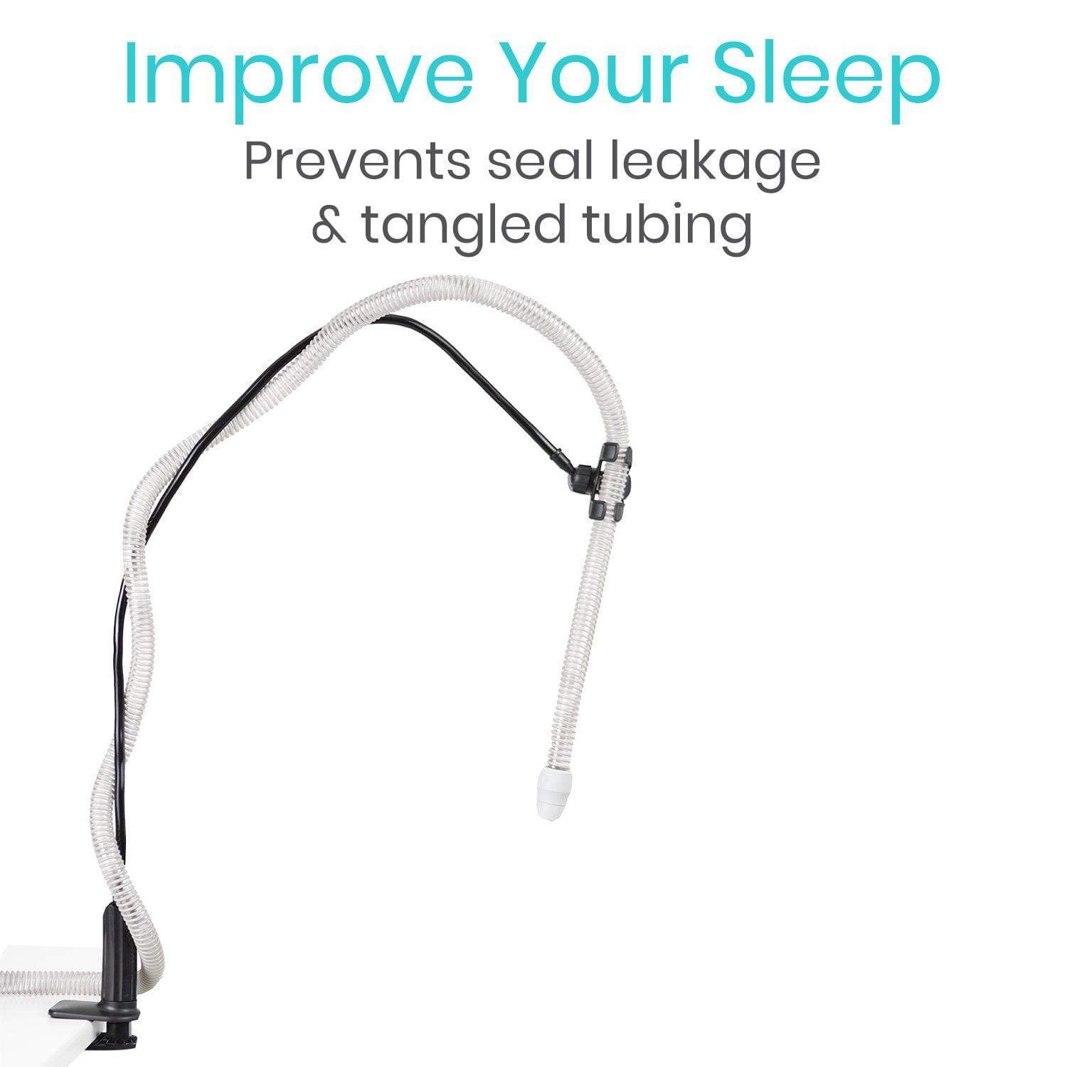 Rest easy night after night with the assistance of the Vive CPAP hose holder. The flexible CPAP tubing holder prevents tangled, twisted tubing that pulls and tugs at your mask while you sleep. Made with a bendable arm and a rotating hose clamp, the CPAP hose holder allows you to position the tubing in the optimal position for uninterrupted sleep. The hose holder also features a versatile clamp that allows the hose holder to be anchored on a nightstand, side table or headboard as needed.
