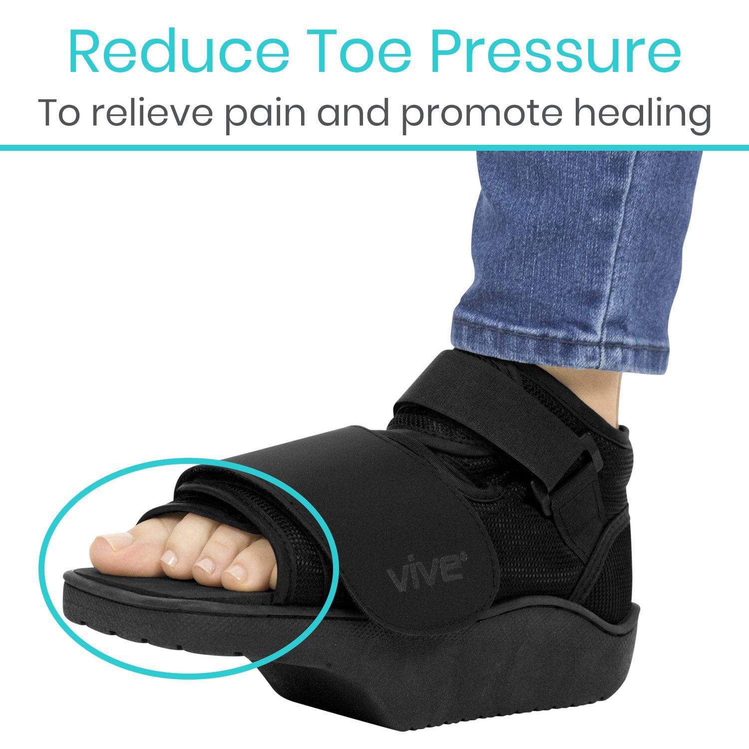Easily adjusting to comfortably accommodate swelling and bandages, the Vive offloading post op shoe cushions and protected injured and broken toes while walking or seated. The angled wedge design relieves painful pressure on the toes and forefoot to promote healing and provide protection with a generously wide square toe box. Featuring a rigid, nonskid base, the post op shoe is reversible for use on the left or right foot as needed and suitable for both men and women.