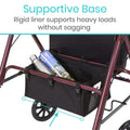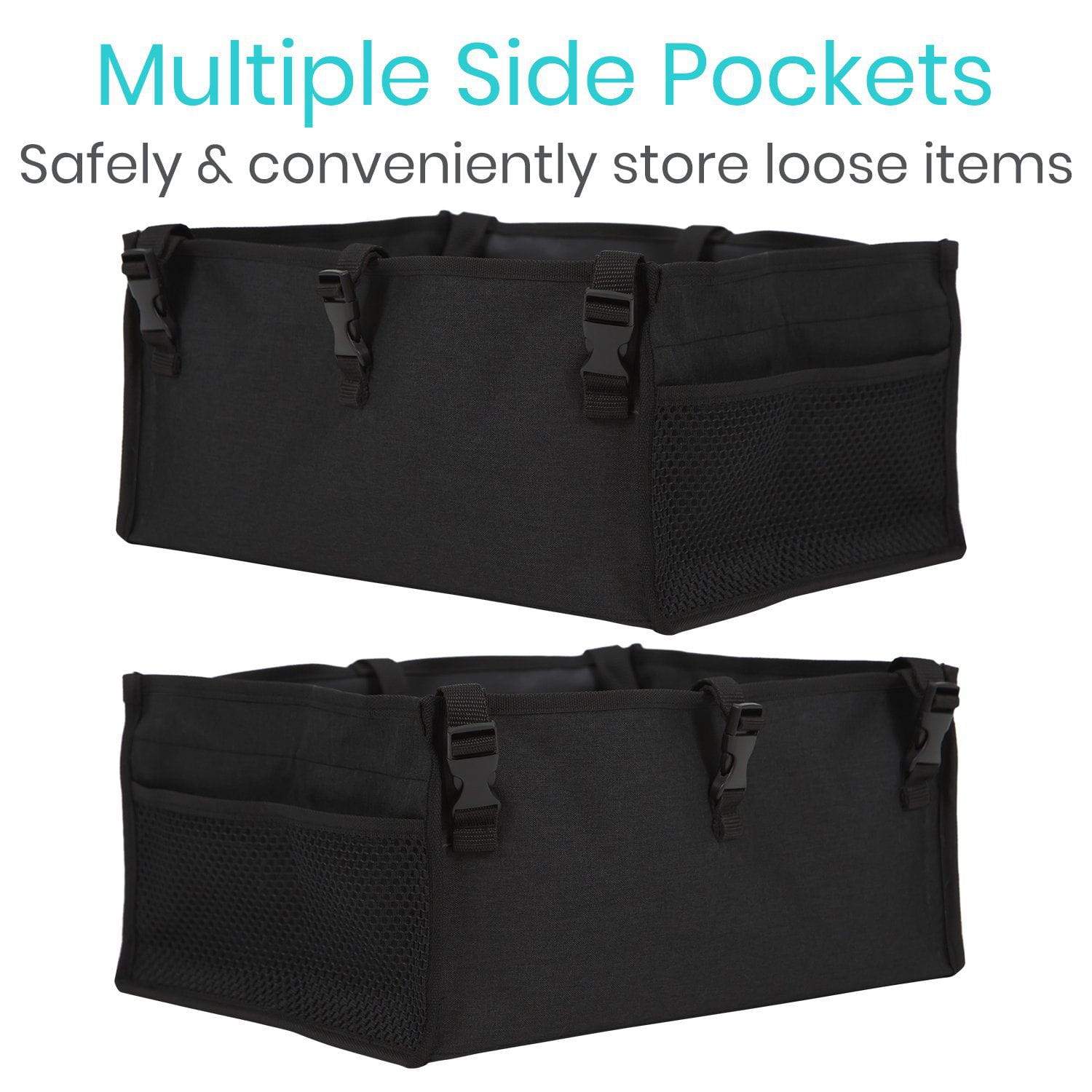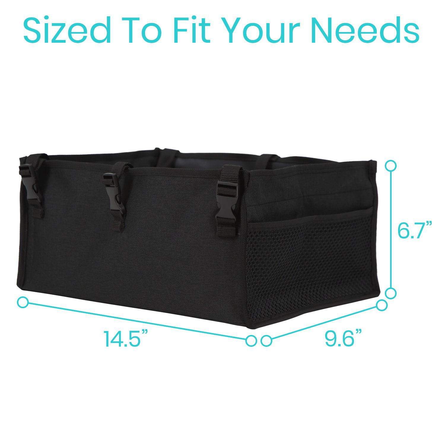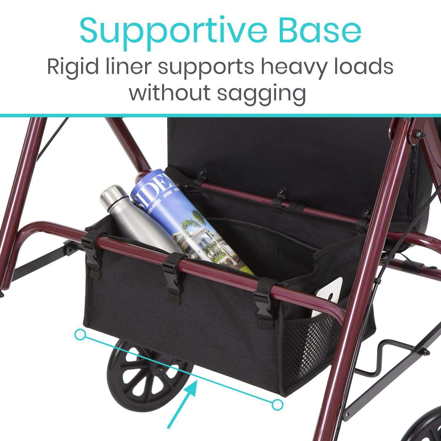 Safely store and carry everyday items with the addition of the Vive rollator seat bag. Securing under the rollator seat, the storage bag features a large interior compartment with front and rear pocket dividers in addition to exterior mesh pockets for easy access. The fabric bag is reinforced with a rigid liner for added stability and includes six adjustable buckle straps for quickly installed on any standard or bariatric rollator.