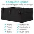 The large under-the-seat bag easily holds a water bottle, snacks, medications, and more