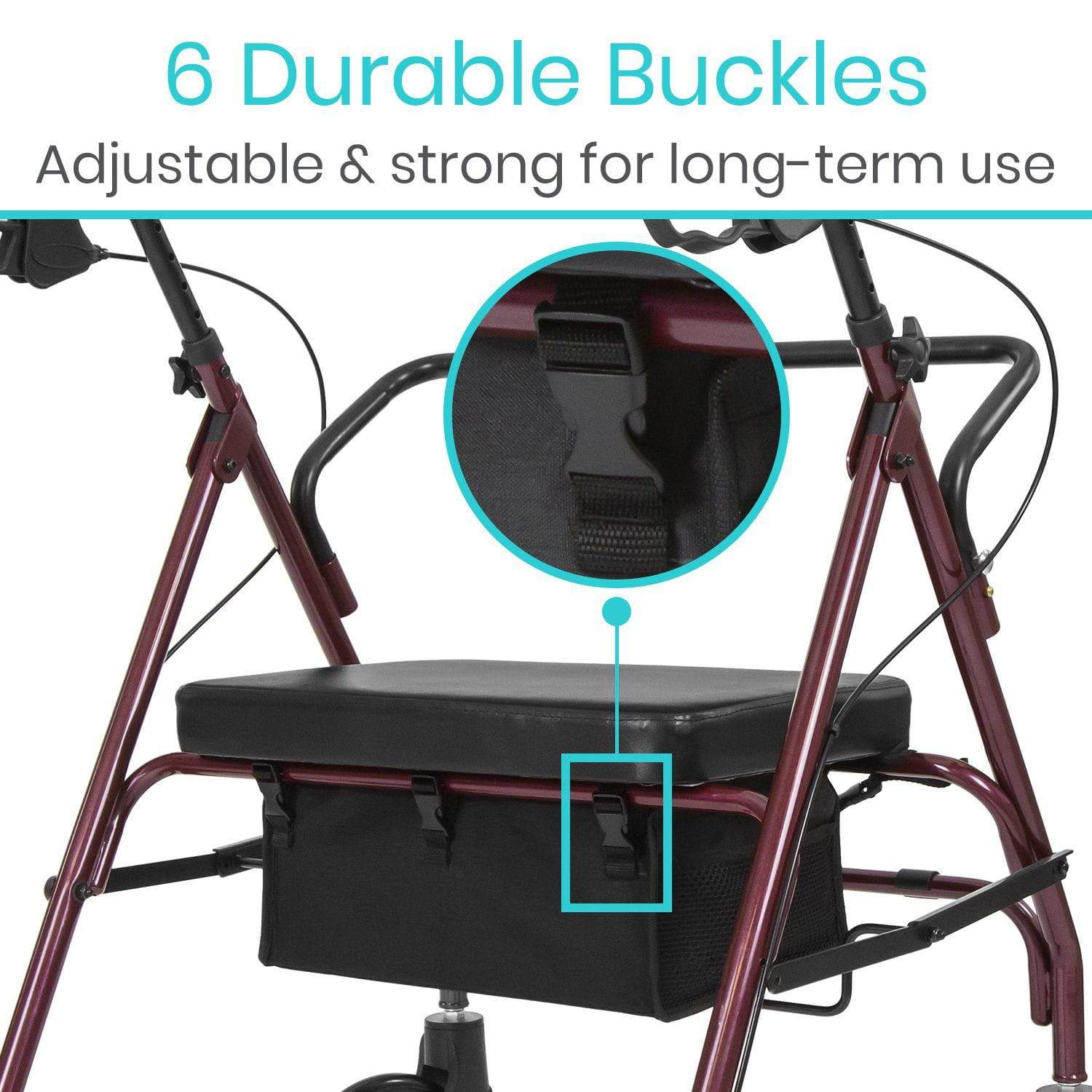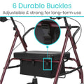 Easily attaches to the rollator frame with six adjustable buckle straps