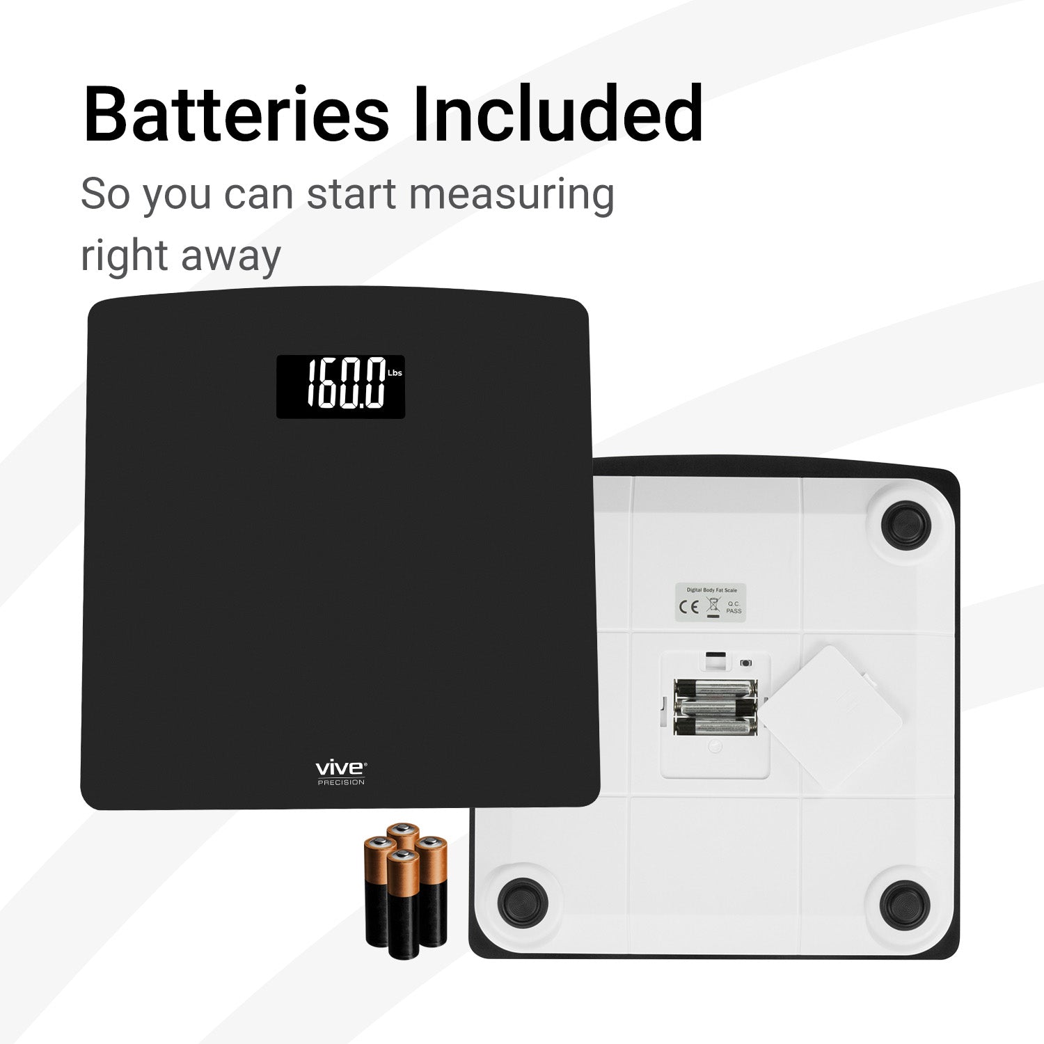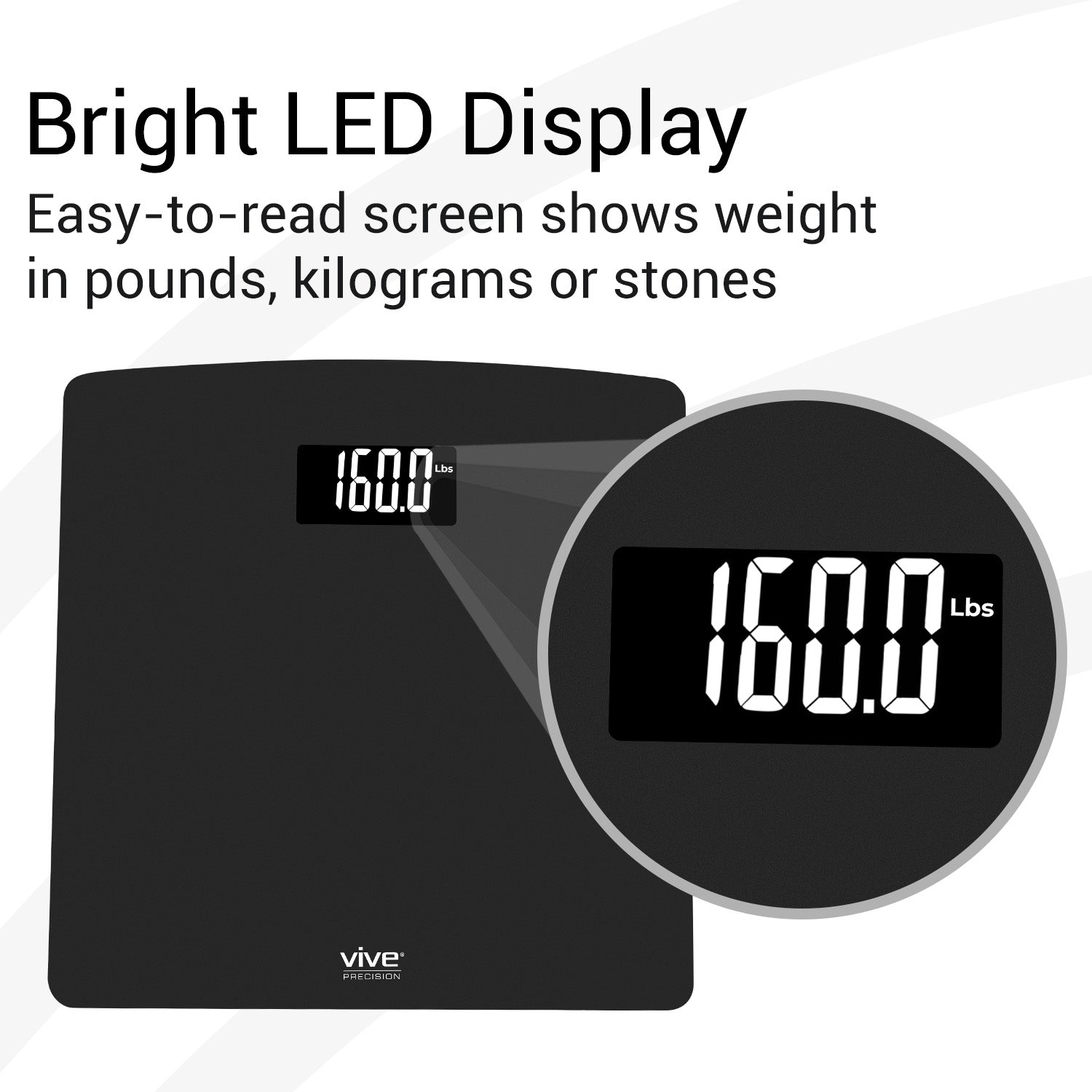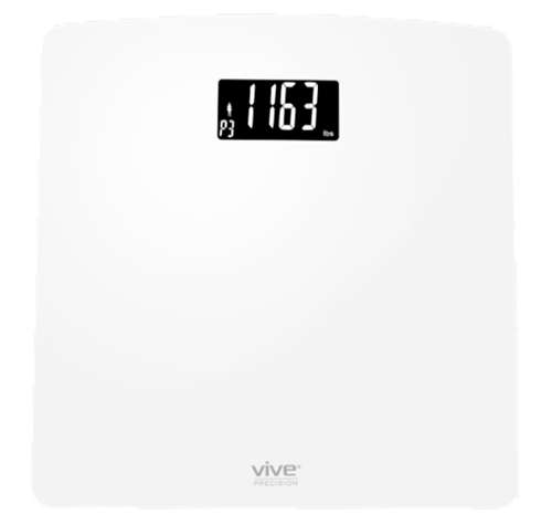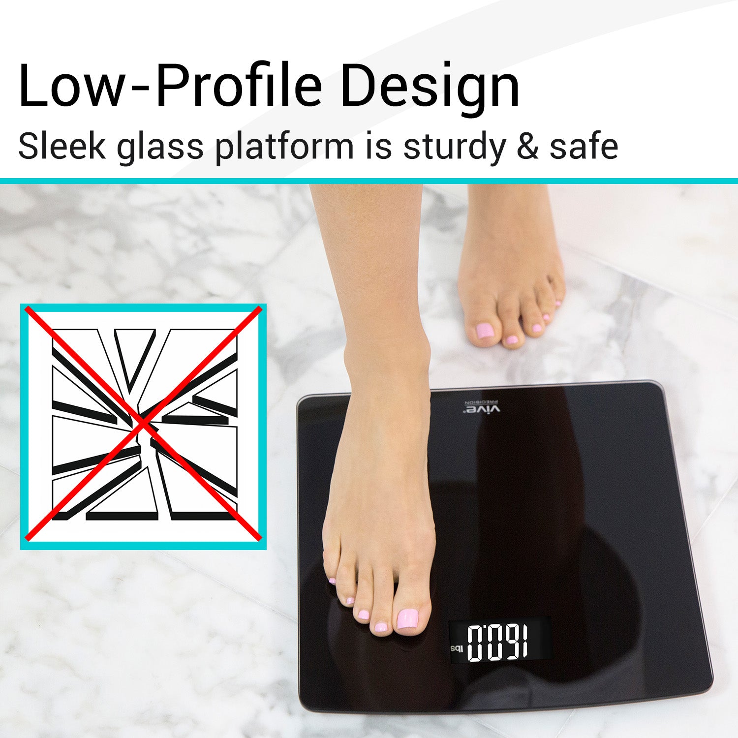 Combining precise measurements and a sleek, modern appearance, the Vive Precision digital scale features a low-profile, tempered glass platform and high-precision sensors for reliable weight measurements up to 400 pounds. The smart scale easily connects to most iOS and Android devices for convenient weight loss monitoring through the Vive Now app, compatible with iOS version 8.0 or higher and Android version 5.0. Measured weight is also displayed on the bright, easy-to-read LED screen in pounds, kilograms, or stones, moments after stepping on the scale, with no tapping required.