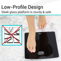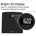 The sleek tempered glass platform features gently rounded corners and a low profile that blends with any decor. Easy to read from any angle, the scale’s bright LED screen displays the detected weight in pounds, kilograms, or stones.