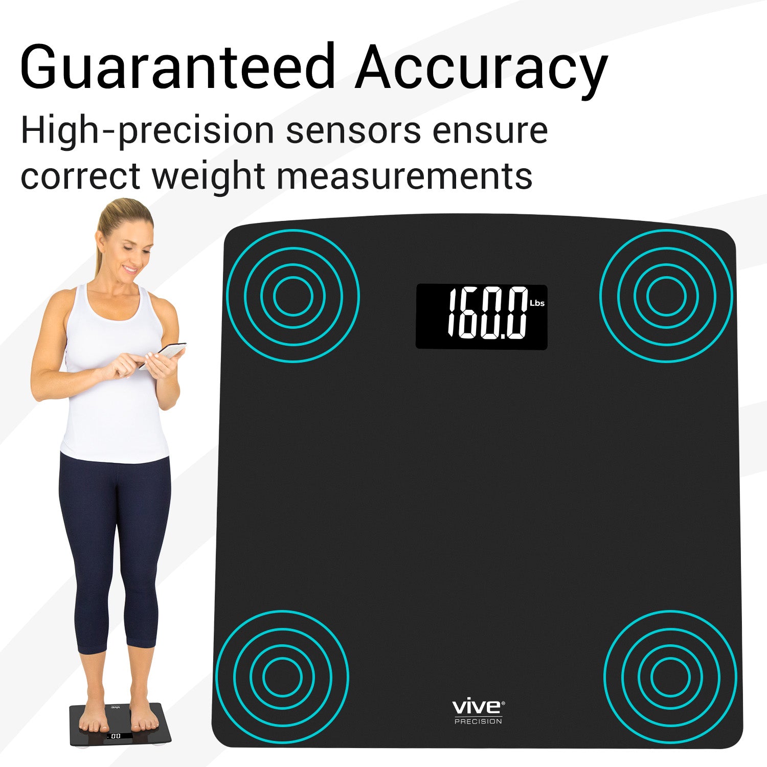 Utilizing high-precision sensors, the Vive Precision digital scale provides accurate weight measurements of up to 400 pounds for personal reference. Each bathroom scale is also individually tested for fast, accurate measurements in 0.1-pound increments.