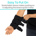 Providing pain-relieving support for cubital tunnel syndrome, tendonitis, arthritis, instability, sprains and fractures, the Vive stabilizing elbow brace supports and immobilizes the elbow joint and forearm. Fitted with two removable aluminum splints, the neoprene brace stabilizes the elbow joints and provides soothing compression therapy to reduce pain, swelling and inflammation and promote natural healing. The reversible elbow brace is made with a soft, breathable blend that stays cool and dry and is perfect for wearing during the day or night. Sized to fit most adults, this elbow splint is easy to put on with an integrated arm sleeve and three adjustable fastener straps with easy pull tabs.