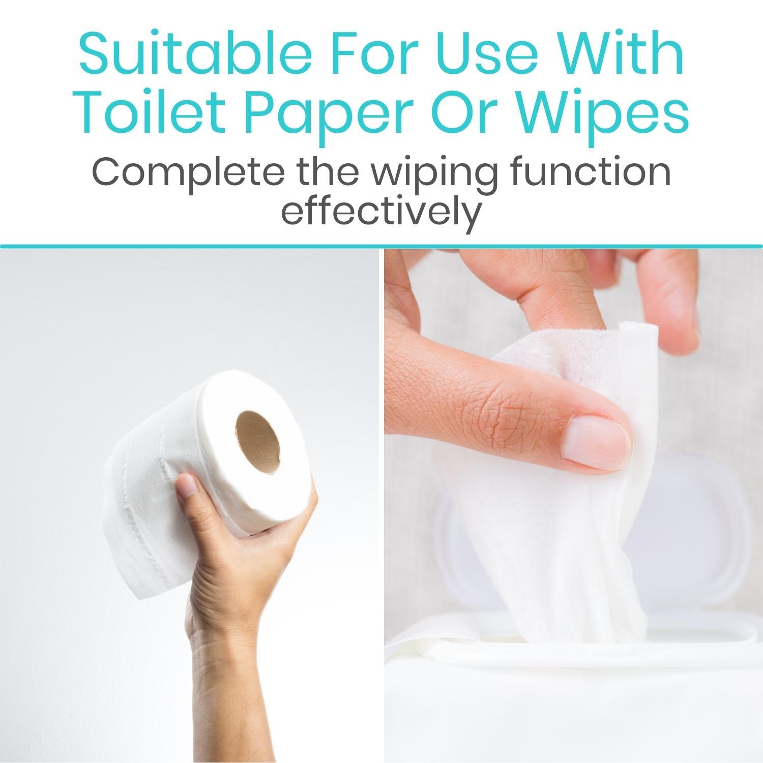 Coated with silicone for a secure grip, the self-wiping tongs are suitable for use with both toilet paper or flushable wipes. The tongs can also be used to hold body wipes, thin washcloths or loofah sponges for cleaning hard-to-reach areas while bathing.