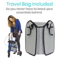 Included accessory bag holds drinks, snacks, glasses and essential items in a secure pouch. The stylish grey rollator bag easily snaps on to the frame and is removable for cleaning and long-term storage.