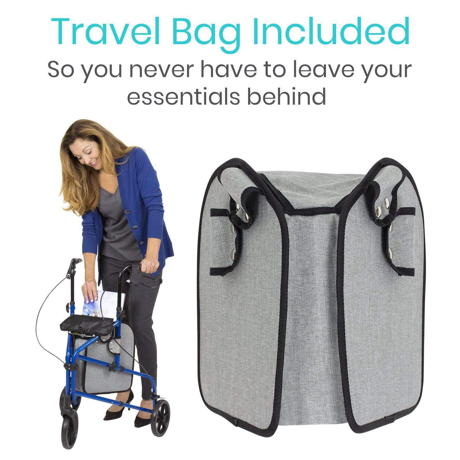 Constructed with durable aluminum, the Vive tri-rollator is exceptionally lightweight and supports up to 250 pounds. Easy to assemble with no tools required, the compact rollator handlebars are also height adjustable for personal comfort. -