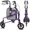 Quickly collapsing for transporting in a vehicle or for convenient storage, the tri-rollator neatly folds in half. The compact rollator is also freestanding when folded for positioning beside a chair or sofa. -