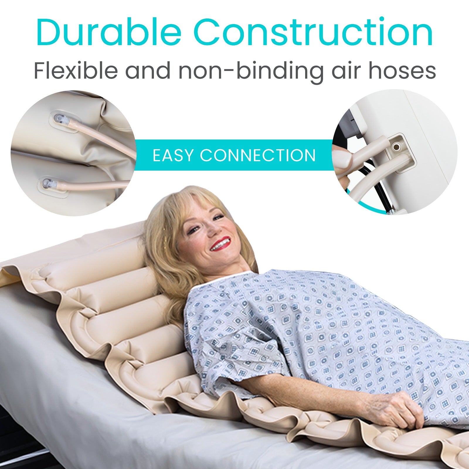 The alternating pressure pad features unique tubular-shaped cells, a design that stands out for its superior ability to distribute pressure evenly. These cylindrical cells conform more naturally to the contours of the body compared to traditional flat cells, for more targeted and effective relief from pressure points.