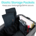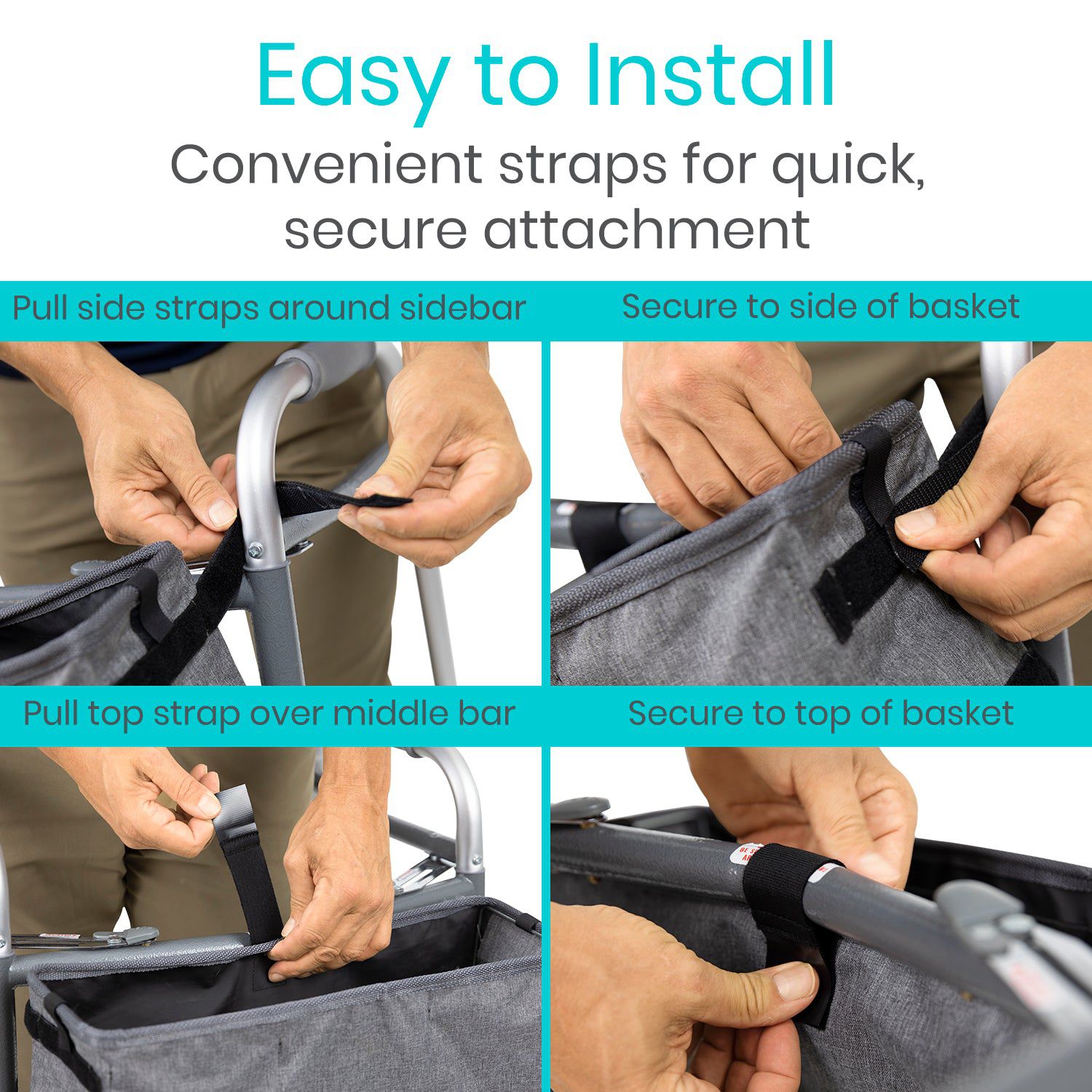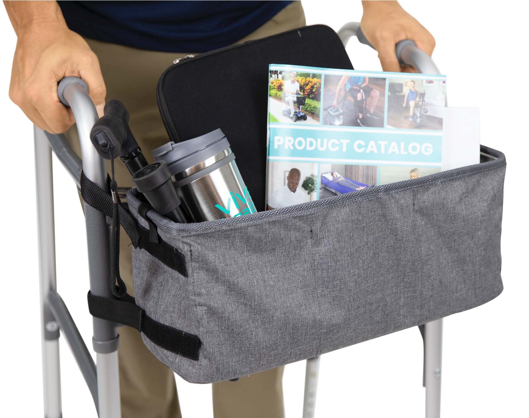 Safely store and carry items needed throughout your day in the Vive walker basket. Made with a stylish, yet sturdy fabric, the solid basket easily attaches with five strong fastener straps to any walker mobility aid. The basket tote features four interior mesh pockets for securing holding a cup or bottle, cell phones or glasses.