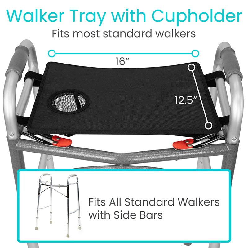Uses: Non-slip top walker tray that straps to most standard walkers with a spot for a cup