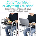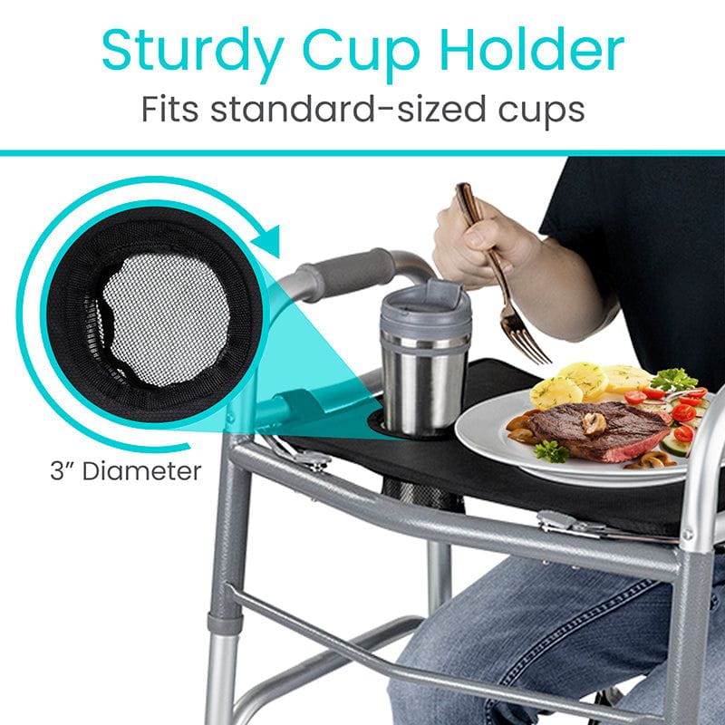 This tray includes a strategically placed cup holder, three inches in diameter, designed to accommodate a diverse array of beverage vessels, from water bottles to coffee tumblers. It effortlessly converts your walker into a practical station for dining or leisure, ensuring your favorite drink is always within arm’s reach